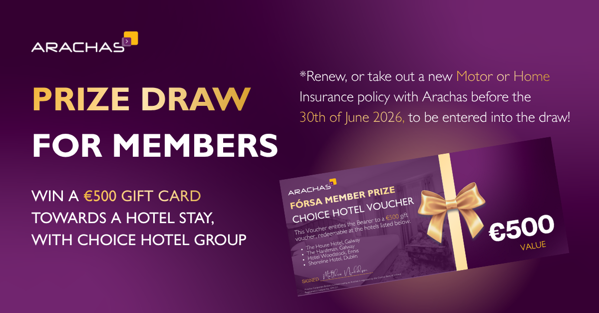Competition Terms & Conditions Prize draw open to members of Fórsa. The candidate must renew or take out a new Motor or Home policy with Arachas to be eligible for this prize draw. The Prize Winner will be chosen at random following the expiry of the offer. Maximum of one entry into draw per person. There is no cash or other prize alternative. Winners will be emailed or phoned. By entering, the winner grants Fórsa & Arachas the right to use and publish their name and they may be asked to have their photo taken. Choice Hotel Group Gift Cards is to the value of €500 and are redeemable at the hotels listed below: